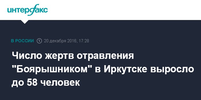 Москва. 20 декабря. INTERFAX.RU - По данным на 21:00 по местному времени (16:00 мск) от отравления суррогатным алкоголем в Иркутске погибли 58 человек, сообщила "Интерфаксу" пресс-секретарь регионального минздрава Татьяна Лебедева.