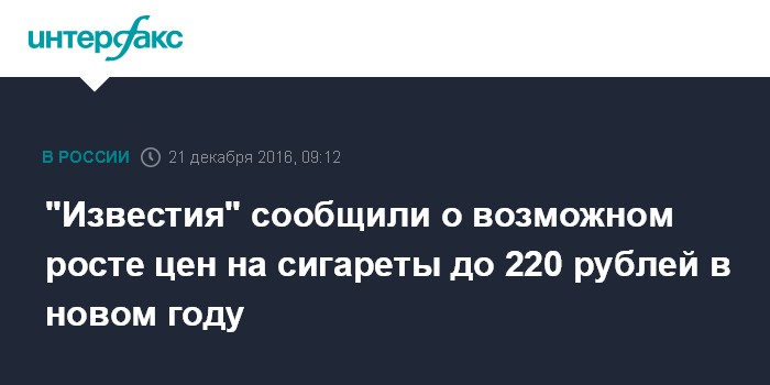 Москва. 21 декабря. INTERFAX.RU - Средняя цена пачки сигарет в 2017 году вырастет и может составить около 220 рублей, пишут "Известия" со ссылкой на подсчеты Министерства внутренних дел.