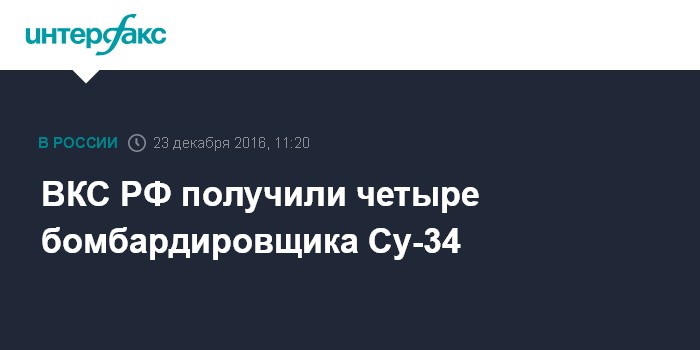 Москва. 23 декабря. INTERFAX.RU - ВКС России получили на вооружение очередные четыре фронтовых бомбардировщика Су-34, сообщил "Интерфаксу" в четверг источник в силовых структурах региона.
