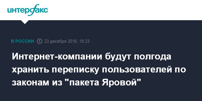 Москва. 23 декабря. INTERFAX.RU - Организаторы распространения информации (ОРИ) по законам из "пакета Яровой" будут хранить содержание электронных сообщений в течение шести месяцев, говорится в проекте постановления правительства.