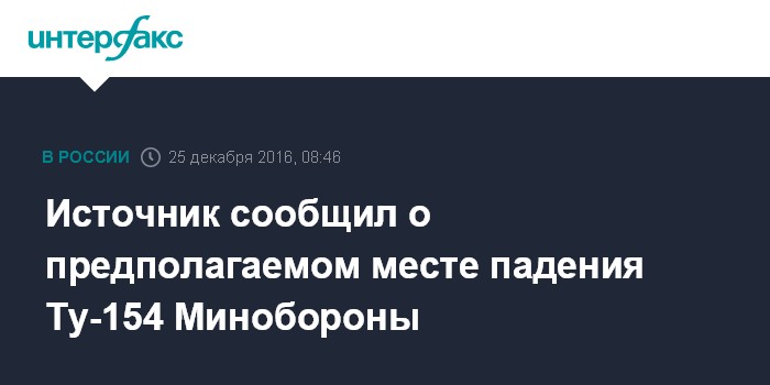 Ранее сообщалось, что самолет Ту-154 вылетел из Сочи в 5:20 мск, а в 5:40 мск пропал с радаров диспетчеров. На борту находились военнослужащие ВС РФ, а также летевшие поздравлять с Новым годом авиагруппу ВКС России на авиабазе "Хмеймим" (Сирия) артисты ансамбля им. Александрова и девять представителей российских СМИ.