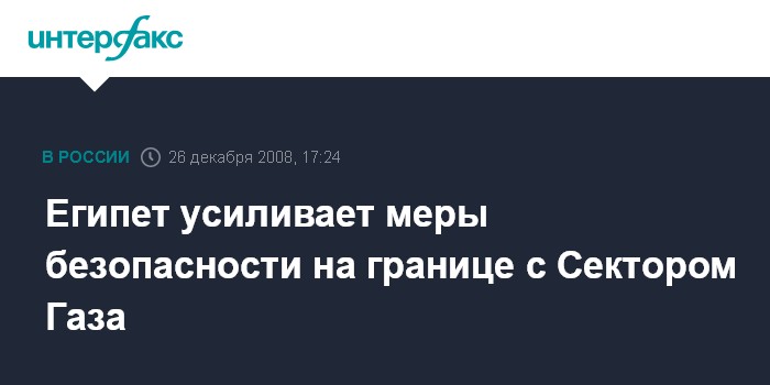 Москва. 26 декабря. INTERFAX.RU - Египет усилил безопасность на своей границе с Сектором Газа в ожидании возможных нападений Израиля на территорию, находящуюся под контролем палестинского движения ХАМАС, сообщает в пятницу южноафриканский информационный канал "Ньюз-24".