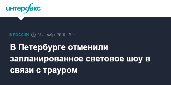 "В связи с объявлением 26 декабря 2016 года днем общенационального траура в России губернатором Петербурга (Георгием Полтавченко - ИФ) принято решение об отмене намеченного на завтра светового шоу на Дворцовой площади. Также правительство Петербурга просит все городские СМИ воздержаться от увеселительных программ", - сообщил "Интерфаксу" пресс-секретарь Полтавченко Андрей Кибитов в воскресенье.