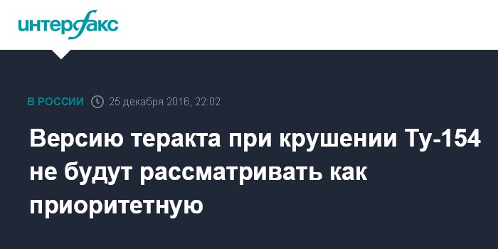 Москва. 25 декабря. INTERFAX.RU - Версия теракта при расследовании крушения самолета Ту-154 в районе Сочи не рассматривается, как основная, сообщил источник в спецслужбах.
