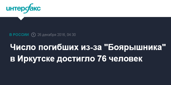 Москва. 26 декабря. INTERFAX.RU - От отравления суррогатным алкоголем в Иркутске погиб еще один человек, общее число жертв достигло 76, сообщила пресс-секретарь регионального Минздрава Татьяна Лебедева.