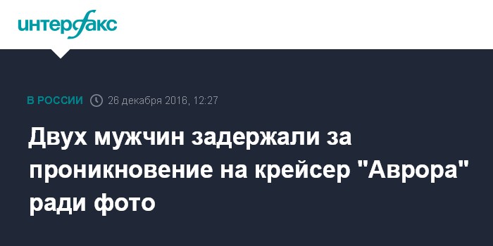 Москва. 26 декабря. INTERFAX.RU - Полицейские задержали на борту крейсера "Аврора" двух мужчин, которые забрались на палубу, чтобы сфотографироваться, сообщили в понедельник "Интерфаксу" в пресс-службе ГУ МВД по Петербургу и Ленобласти.
