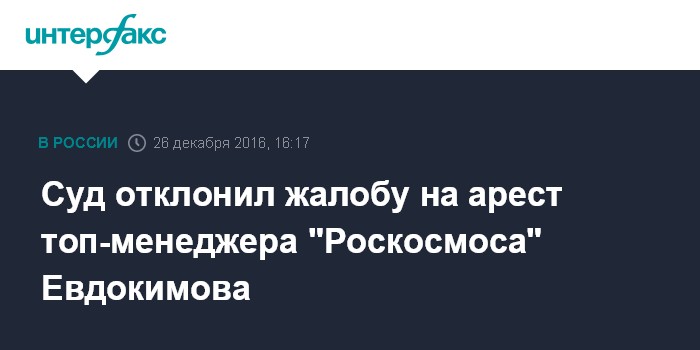 Москва. 26 декабря. INTERFAX.RU - Мосгорсуд в понедельник признал законным арест исполнительного директора по контролю качества и надежности госкорпорации "Роскосмос" Владимира Евдокимова, обвиняемого в мошенничестве с недвижимостью РСК "МиГ" на 200 млн рублей.
