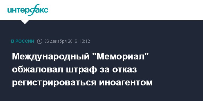 Москва. 26 декабря. INTERFAX.RU - Международный "Мемориал" подал в Мосгорсуд жалобу на назначенный штраф за отказ добровольно регистрироваться НКО-иноагентом, сообщила исполнительный директор общества Елена Жемкова.