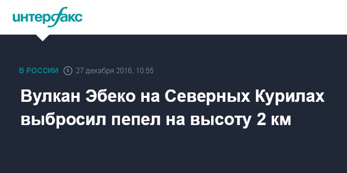 Москва. 27 декабря. INTERFAX.RU - Очередной пепловый выброс на высоту 2 км зарегистрирован в понедельник днем на вулкане Эбеко, расположенном на острове Парамушир (Северные Курилы, Сахалинская область), сообщает во вторник Камчатская группа реагирования на вулканические извержения (KVERT).