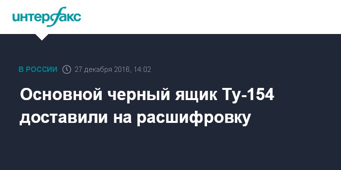 Москва. 27 декабря. INTERFAX.RU - Основной бортовой самописец Ту-154 Минобороны РФ, потерпевшего крушение под Сочи, доставлен в Центральный НИИ ВКС в подмосковных Люберцах, сообщает министерство.