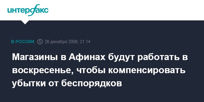 Афины. 26 декабря. INTERFAX.RU - Владельцы магазинов в Афинах решили не прекращать работу в ближайшее воскресенье, чтобы попытаться компенсировать убытки, вызванные недавними масштабными беспорядками.