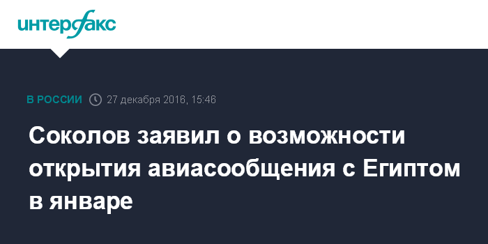 Москва. 27 декабря. INTERFAX.RU - Министр транспорта РФ Максим Соколов считает, что регулярное авиасообщение с Египтом может быть возобновлено в начале следующего года.