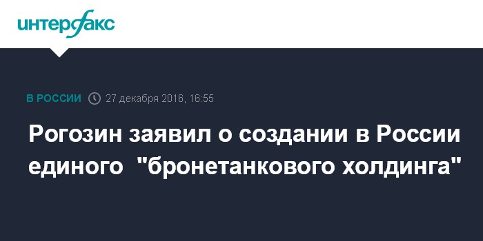 Москва. 27 декабря. INTERFAX.RU - Передача госкорпорации "Ростех" 100% "Уралвагонзавода" проходит в рамках создания единого "бронетанкового холдинга", сообщил вице-премьер Дмитрий Рогозин.