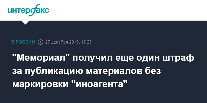 Ранее сообщалось, что 14 декабря ПЦ "Мемориал" был оштрафован также на 300 тыс. рублей по аналогичному административному протоколу.