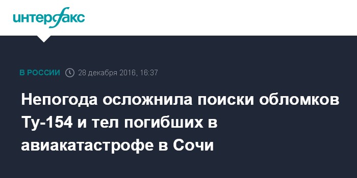 Москва. 28 декабря. INTERFAX.RU - Работу спасателей по поиску фрагментов разбившегося самолета Ту-154 и тел погибших в авиакатастрофе осложнила непогода.