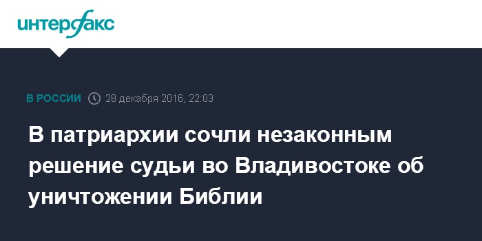 Москва. 28 декабря. INTERFAX.RU - В Московской патриархии выступили с критикой постановления мирового судьи Владивостока о конфискации и уничтожении 36 экземпляров Библии.