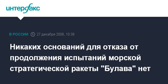 Никаких оснований для отказа от продолжения испытаний морской стратегической ракеты "Булава" нет