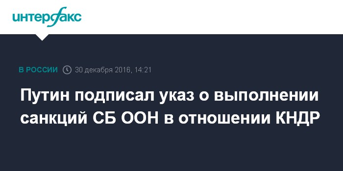 Москва. 30 декабря. INTERFAX.RU - Президент РФ Владимир Путин подписал указ, предусматривающий меры по выполнению резолюции Совбеза ООН 2270 в отношении КНДР.