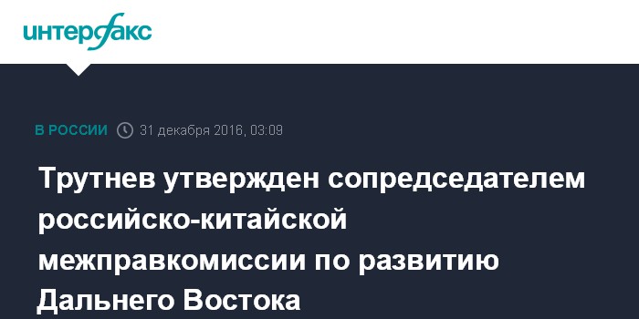 Москва. 31 декабря. INTERFAX.RU - Председателем российской части Межправительственной российско-китайской комиссии по сотрудничеству и развитию Дальнего Востока РФ и Северо-Востока КНР утвержден вице-премьер Юрий Трутнев, сообщается в субботу на официальном интернет-портале правовой информации.