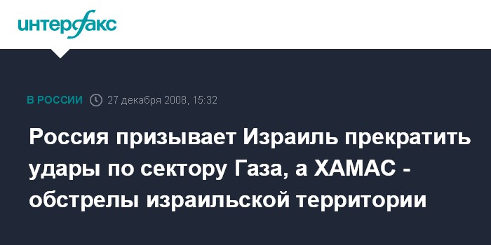 Москва. 27 декабря. INTERFAX.RU - Россия выступает за немедленное прекращение силовых действий Израиля против сектора Газа и обстрелов израильской территории со стороны движения ХАМАС.