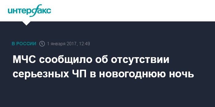 Москва. 1 января. INTERFAX.RU - Новогодняя ночь в России прошла без каких-либо серьезных происшествий, на массовых мероприятиях инцидентов не произошло, сообщили в пресс-службе МЧС России.