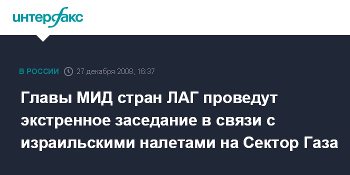Москва. 27 декабря. INTERFAX.RU - Министры иностранных дел стран-членов Лиги арабских государств (ЛАГ) намерены провести в ближайшие два дня экстренное заседание по ситуации в Cекторе Газа, сообщает информационный телеканал "Вести-24" со ссылкой на генсека этой крупнейшей межарабской организации Амра Мусу.