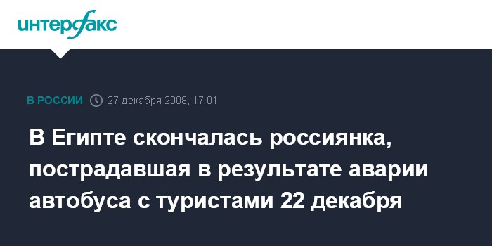 Москва. 27 декабря. INTERFAX.RU - В госпитале египетского города Шарм-эль-Шэйх скончалась еще одна российская туристка, пострадавшая в автокатастрофе в минувший понедельник, сообщает в субботу телеканал "Вести-24".