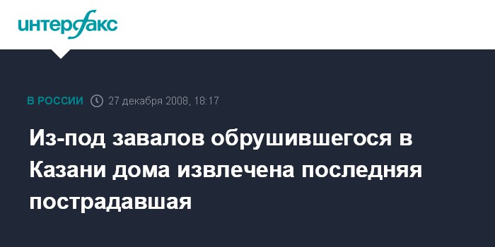 Москва. 27 декабря. INTERFAX.RU - Сотрудники МЧС извлекли из-под завалов обрушившегося в Казани дома последнюю пострадавшую.