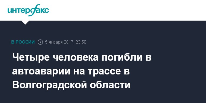 Москва. 5 января. INTERFAX.RU - Четыре человека погибли и двое пострадали в дорожно-транспортном происшествии на трассе в Волгоградской области, сообщает пресс-служба регионального главка МВД.