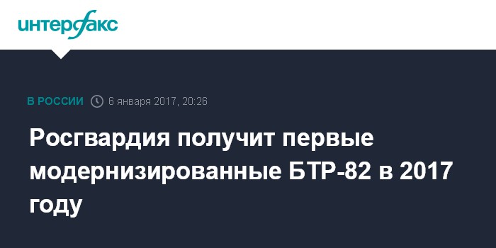 Москва. 6 января. INTERFAX.RU - Модернизированный бронетранспортер БТР-82В начнет поступать в Росгвардию во второй половине 2017 года, сообщил журналистам заместитель главкома войск Росгвардии Сергей Ерыгин.