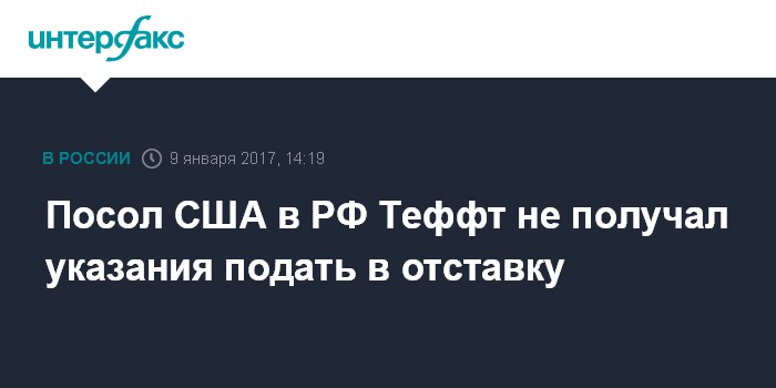"Всем политическим назначенцам администрации (Барака) Обамы поступили указания написать заявления об отставке до 7 декабря, которые вступят в силу в полдень 20 января. Карьерным сотрудникам дипломатической службы подобных указаний не поступало. В целом верно и то, что все послы исполняют свои обязанности по воле президента", - сказала Олсон "Интерфаксу", отвечая на вопрос о том, когда Теффт может покинуть Россию.