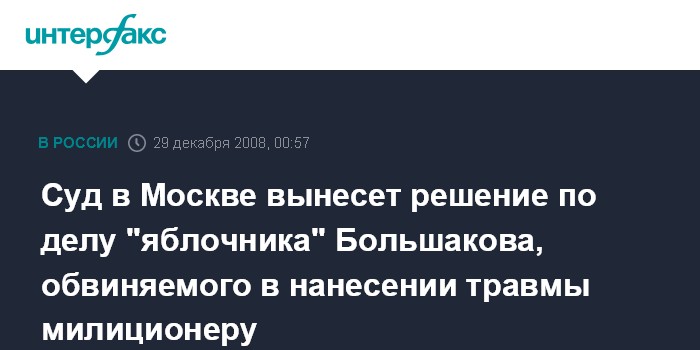Москва. 29 декабря. ИНТЕРФАКС - Вынесение решения по делу заместителя председателя московского отделения партии "Яблоко" Ивана Большакова ожидается в понедельник в Зюзинском суде Москвы.