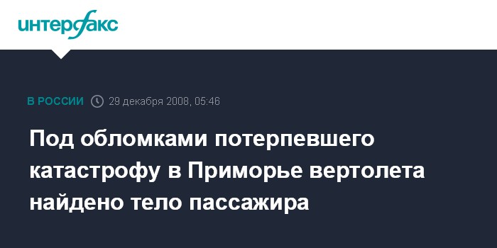 Хабаровск. 29 декабря. ИНТЕРФАКС-ДАЛЬНИЙ ВОСТОК - При облете места крушения вертолета "Эврокоптер-ACS-350" в Приморском крае визуально обнаружено тело погибшего пассажира, сообщила агентству "Интерфакс - Дальний Восток" старший помощник руководителя Дальневосточного следственного управления на транспорте Наталья Салкина.