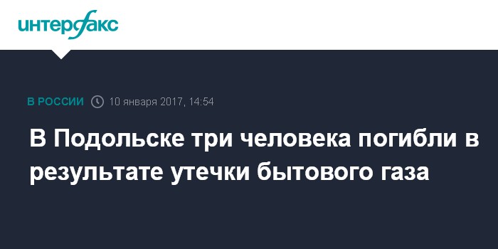 Москва. 10 января. INTERFAX.RU - Три человека погибли, еще восемь госпитализированы с отравлением в подмосковном Подольске в результате утечки бытового газа, сообщила представитель областного главка СКР Елена Фокина.