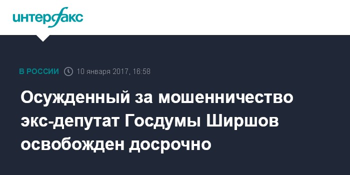 Осужденный за мошенничество экс-депутат Госдумы Ширшов освобожден досрочно