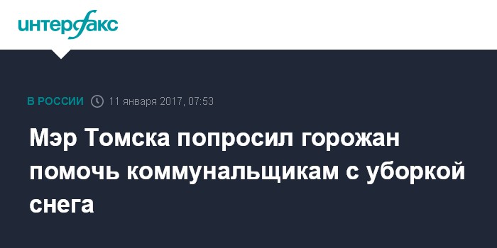Москва. 11 января. INTERFAX.RU - Мэр Томска Иван Кляйн обратился к горожанам в связи с ситуацией, сложившейся в областном центре из-за аномальных снегопадов. В заявлении, опубликованном на сайте горадминистрации в среду, он попросил людей помочь коммунальщикам, которые не справились с уборкой улиц.