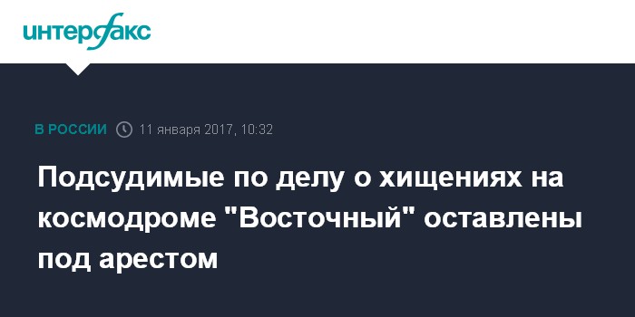 Москва. 11 января. INTERFAX.RU - Дальневосточный окружной военный суд продлил сроки ареста фигурантам уголовного дела о хищениях более 5 млрд рублей при строительстве космодрома "Восточный".
