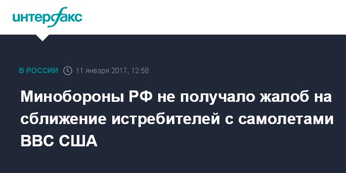 Москва. 11 января. INTERFAX.RU - Российские военные заявили, что по официальным каналам не получали от Пентагона информации об опасном приближении истребителей РФ в Сирии к самолетам ВВС США, и настаивают на высоком профессионализме российских летчиков.