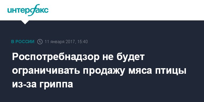 Москва. 11 января. INTERFAX.RU - Вводить ограничения на реализацию мяса птицы из-за птичьего гриппа на сегодняшний день не нужно, заявила глава Роспотребнадзора, главный санитарный врач России Анна Попова.