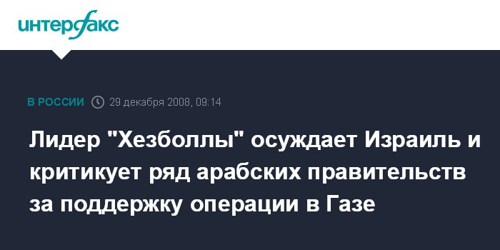 Москва. 29 декабря. INTERFAX.RU - Лидер действующего в Ливане радикального шиитского движения "Хезболла" Хасан Насралла, обращаясь к сторонникам в эфире ливанского телеканала "Аль-Манар", осудил Израиль за удары по сектору Газа и обвинил ряд арабских правительств в "заговоре" с Израилем.