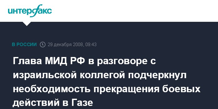 Москва. 29 декабря. INTERFAX.RU - Ситуация в секторе Газа стала основной темой телефонного разговора главы российского МИД Сергея Лаврова с министром иностранных дел Израиля Ципи Ливни, сообщает в воскресенье МИД РФ.