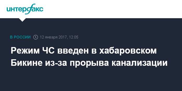 Москва. 12 января. INTERFAX.RU - Режим чрезвычайной ситуации объявлен в хабаровском Бикине после порыва на канализационном коллекторе, сообщил в четверг агентству "Интерфакс" глава города Владимир Березовский.