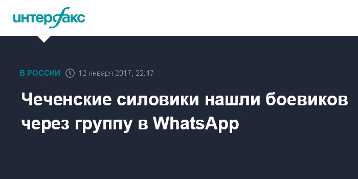 Москва. 12 января. INTERFAX.RU - Силовики Чеченской республики провели спецоперацию против боевиков, которых удалось обнаружить благодаря переписке в мессенджере WhatsApp, сообщил в четверг "Коммерсант" со ссылкой на источник. Переписку удалось обнаружить после того, как полицейские стали останавливать молодых людей для проверки автомобилей и гаджетов.