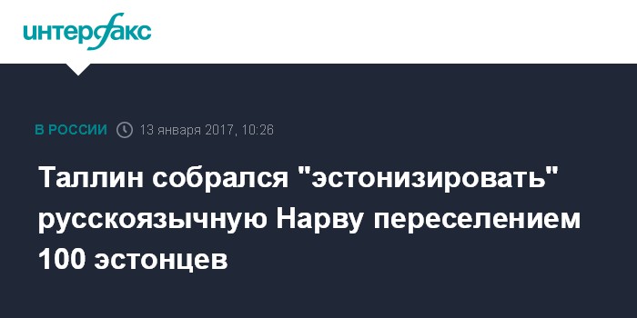 Москва. 13 января. INTERFAX.RU - В правительстве Эстонии хотят встретить 100-летие эстонского государства, которое будет отмечаться в 2018 году, переселением ста эстонцев в приграничный с Россией и преимущественно русскоговорящий город Нарва.