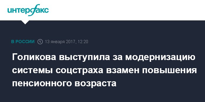 "Я бы начала не с повышения пенсионного возраста, а с модернизации системы социального страхования в целом и напомнила бы о том, что система социального страхования создается для работающих граждан. У нас сегодня в этой системе обслуживаются не только работающие граждане, но и граждане, не работающие, граждане, уплачивающие существенно меньшие размеры в систему социального страхования, чем получающие из нее. Отсюда возникает несбалансированность системы", - сказала Голикова.