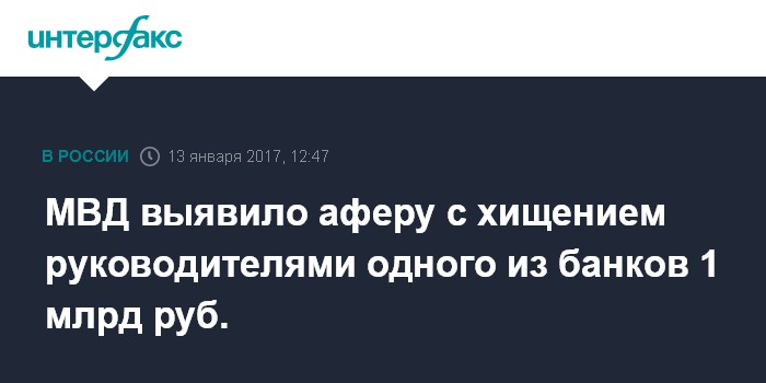 Москва. 13 января. INTERFAX.RU - МВД обнаружило аферу с хищением руководством одного из банков 1 млрд рублей, сообщила пресс-служба ведомства. Однако название банка не уточняется.