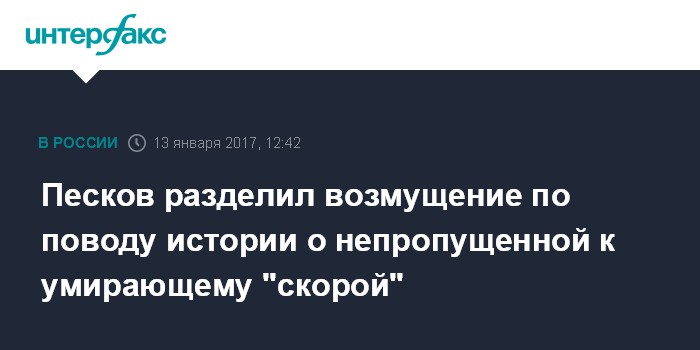 Москва. 13 января. INTERFAX.RU - Пресс-секретарь президента РФ Дмитрий Песков выразил надежду на то, что поведению водителя, отказ которого пропустить машину "скорой помощи" привел к гибели пациента, будет дана юридическая оценка.