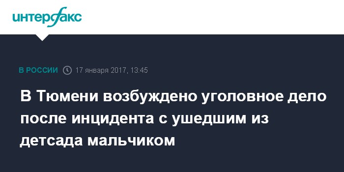 Москва. 17 января. INTERFAX.RU - Следственные органы в Тюмени возбудили уголовное дело в связи с инцидентом в детском саду, из которого ушел пятилетний воспитанник. Об этом сообщает пресс-служба СУ СКР по Тюменской области во вторник.