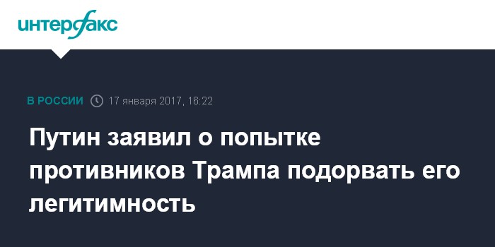 "Мы наблюдаем продолжающуюся острую внутриполитическую борьбу, несмотря на то, что выборы президента завершены, и они завершились убедительной победой господина Трампа. Тем не менее, в ходе этой борьбы, на мой взгляд, ставится несколько задач, может, их больше, но некоторые из них очевидны. Первая - подорвать легитимность избранного президента США", - сказал Путин во вторник на пресс-конференции по итогам переговоров с президентом Молдавии Игорем Додоном.