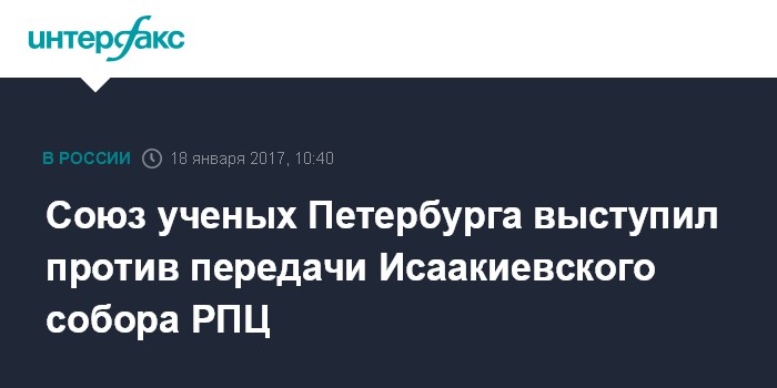 Москва. 18 января. INTERFAX.RU - Санкт-Петербургский союз ученых выступил против передачи Исаакиевского собора Русской православной церкви , заявление опубликовано на сайте организации.